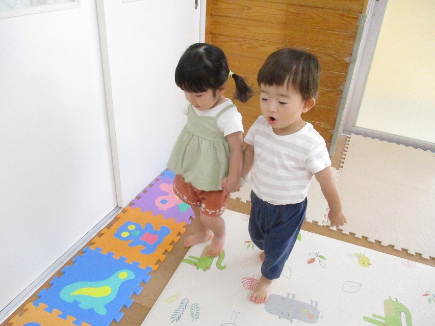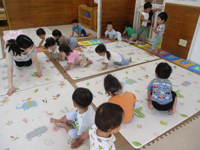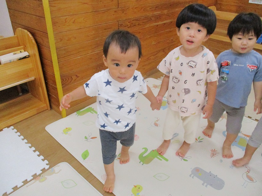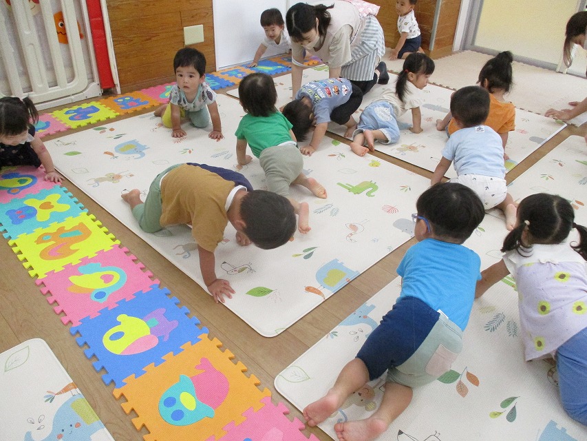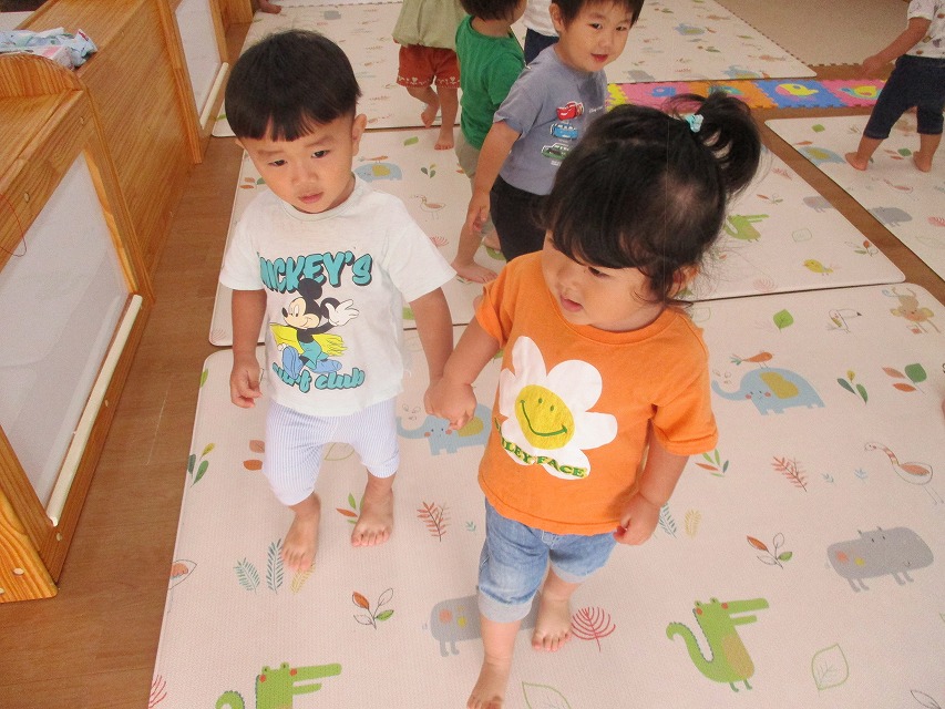15時のおやつの後には、「パンダウサギコアラ」の歌に合わせてハイハイをしたり、「さんぽ」の曲に合わせてお友達と手を繋いで歩く練習もしています。