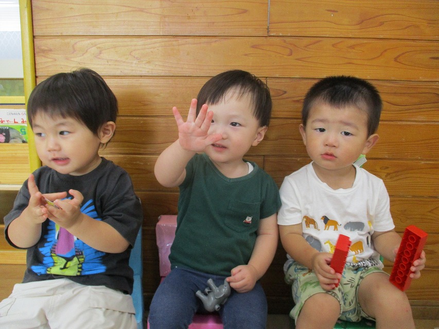 さくら組さんは、手遊びや絵本が大好き!「ペンギンマークの百貨店」や「りんごがコロコロ」「おにぎり」の手遊びを楽しんで歌っています。
