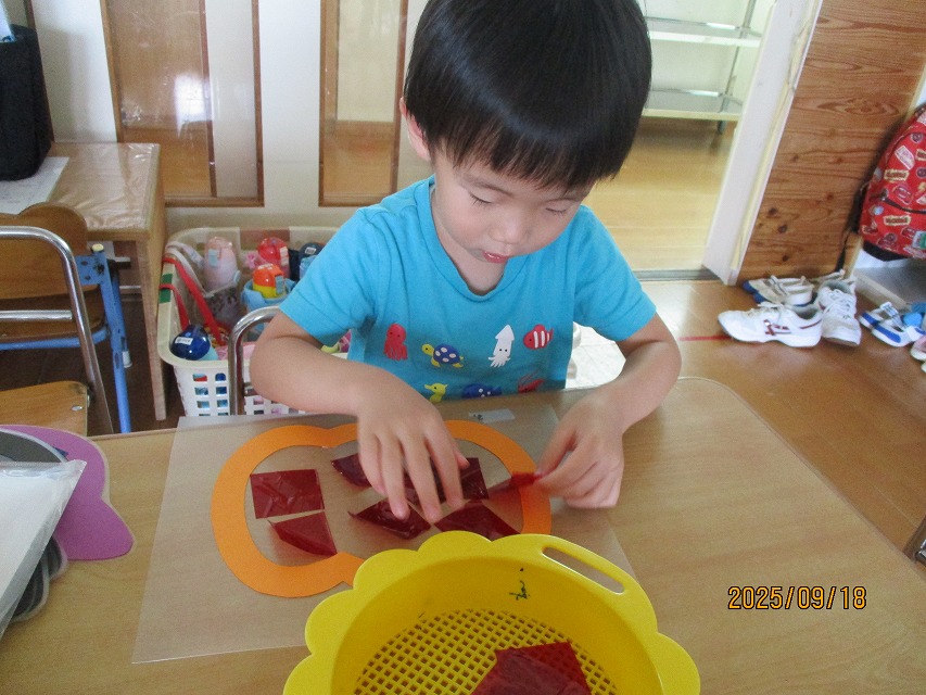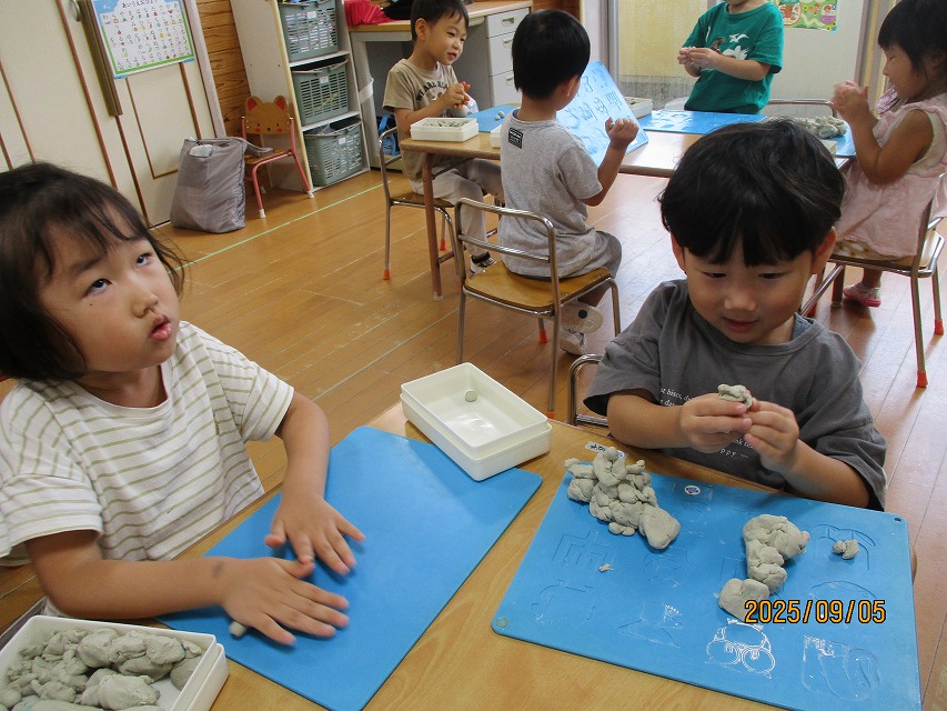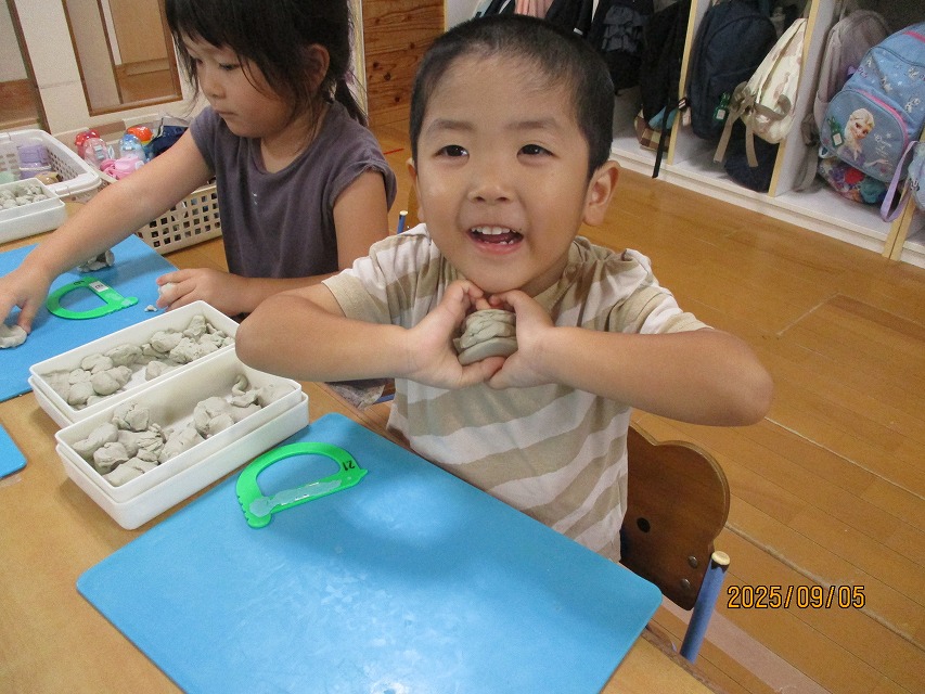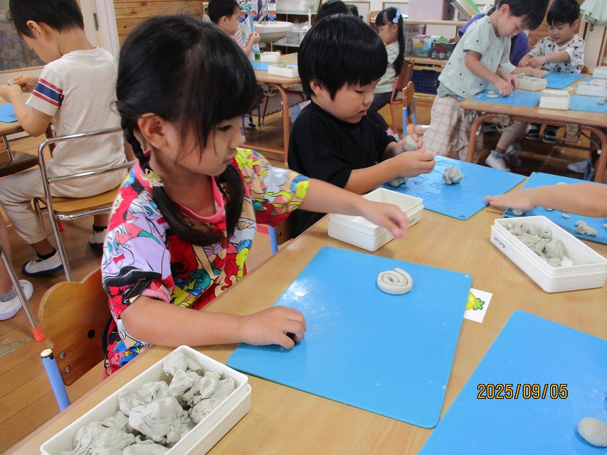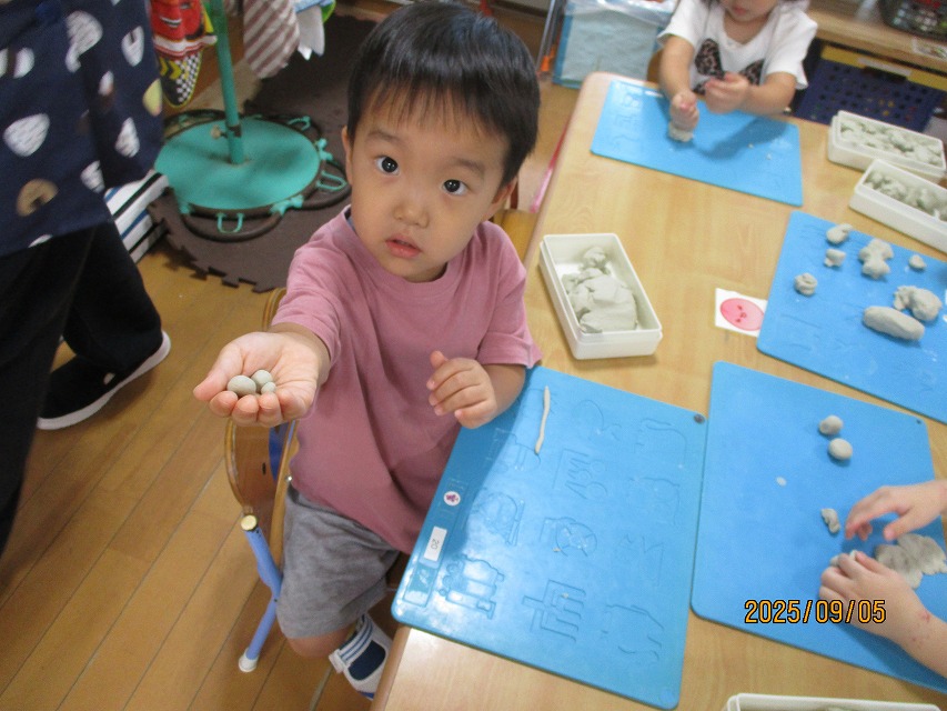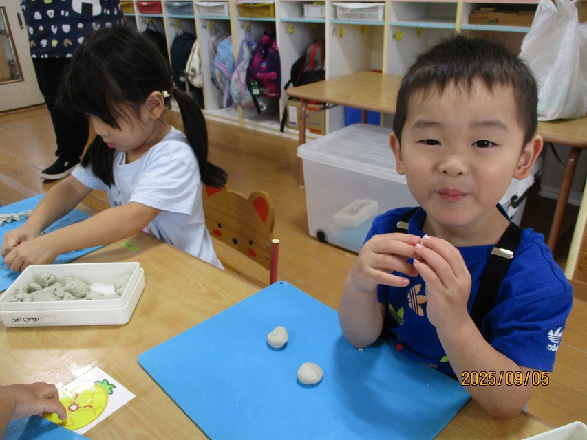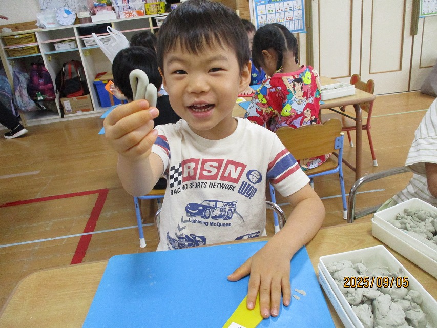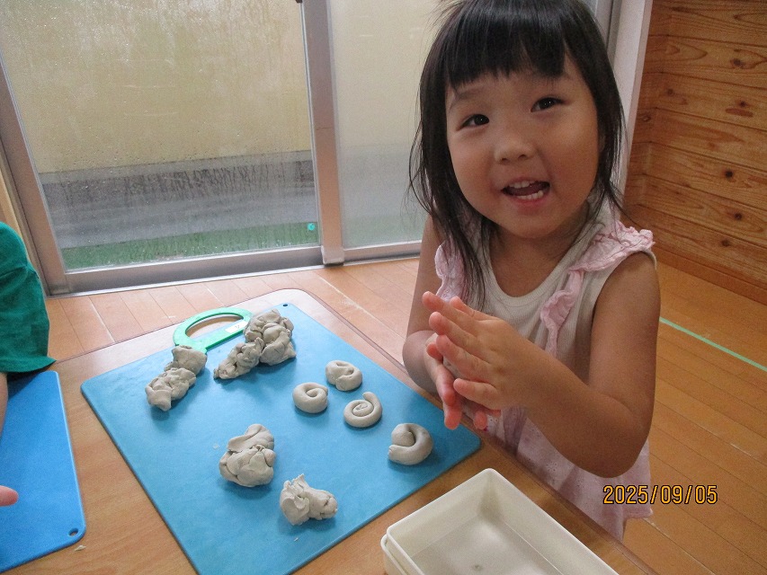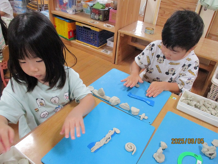 飴、電車、お弁当、へびなど作ったものを嬉しそうに友達や保育教諭に見せてくれます♪
