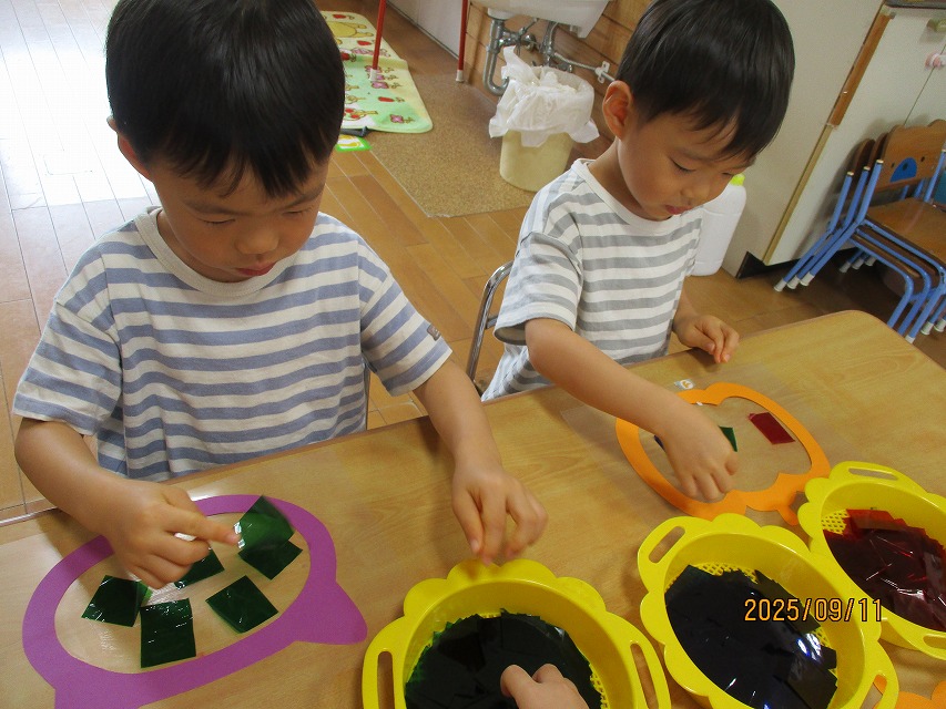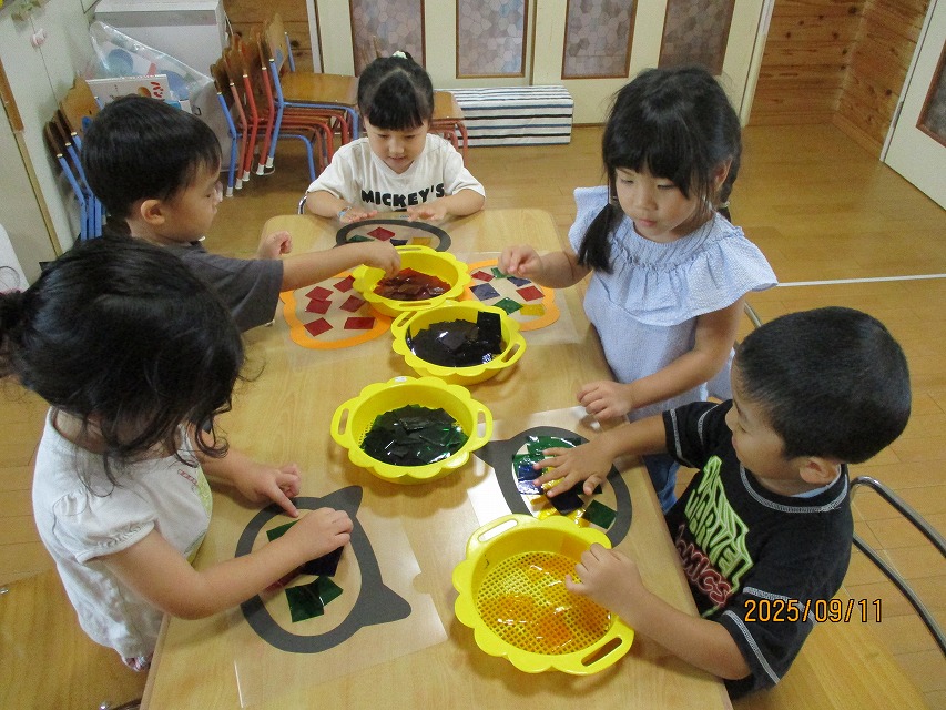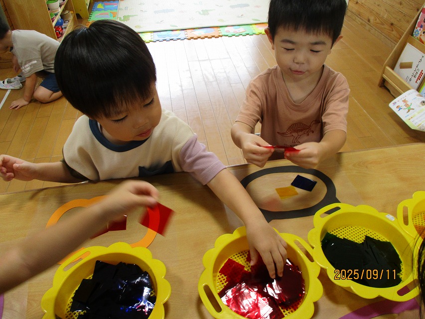 水遊び、色水遊びで色の変化に興味を持った園児たち。赤と緑を重ねたら何色になるかな?