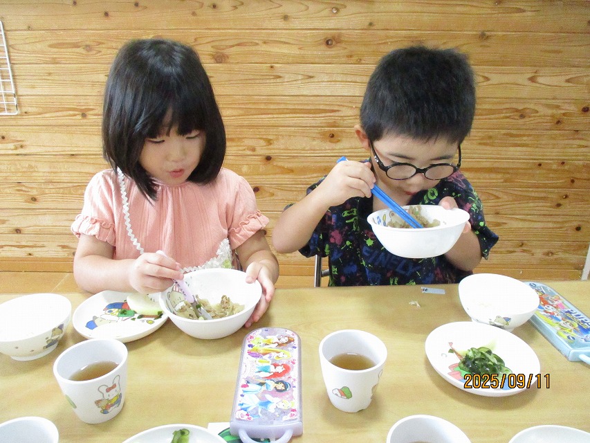 左手をお皿に添えるなど、食事のマナーも知りながら、お友達との会話も弾ませながら楽しく食べています(^^)/