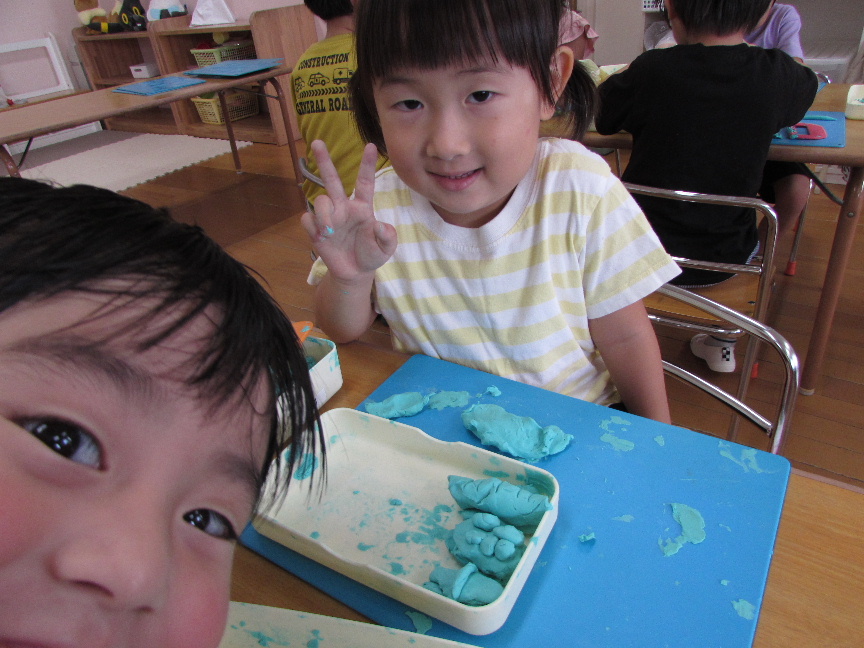 自由遊びの時間で、なにやら黙々と作っている園児。完成したのは友達が大好きなブラキオサウルスでした! 「これあげるわ!」と言ってプレゼントしていました♪
