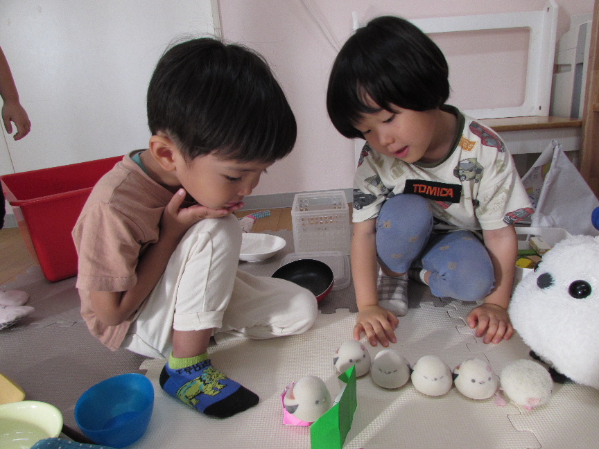 それでは室内遊びから。保育教諭と一緒に折り紙でピアノと椅子を作ると、「そうだ!いいこと思いついた💡」と言ってままごとコーナーへ。シマエナガの人形に大きさがぴったりだったみたいです♪ 並んで聞いているシマエナガが可愛いですね♡