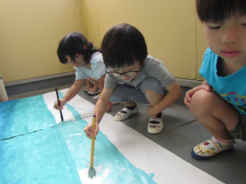 ベランダで絵の具を使って空を描きました。グラデーションを表現するために色を少しずつ混ぜて、少しの色の変化にも気付く子どもたちでした。