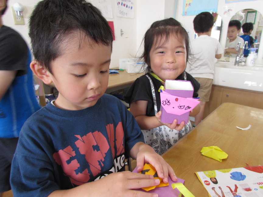 ハロウィンの製作では、折り紙でジャックオランタンと猫を折って自分なりのお菓子入れを作りました♪