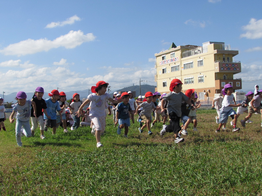 続いて戸外遊び。広場では5歳児ゆり組さんと一緒によーいドン! 運動会でお互いが走る姿を見ていたので、早く走ろうと頑張っていました♪ いい天気の広場は思いっきり体を動かせるのでとても気持ちがいいですね!