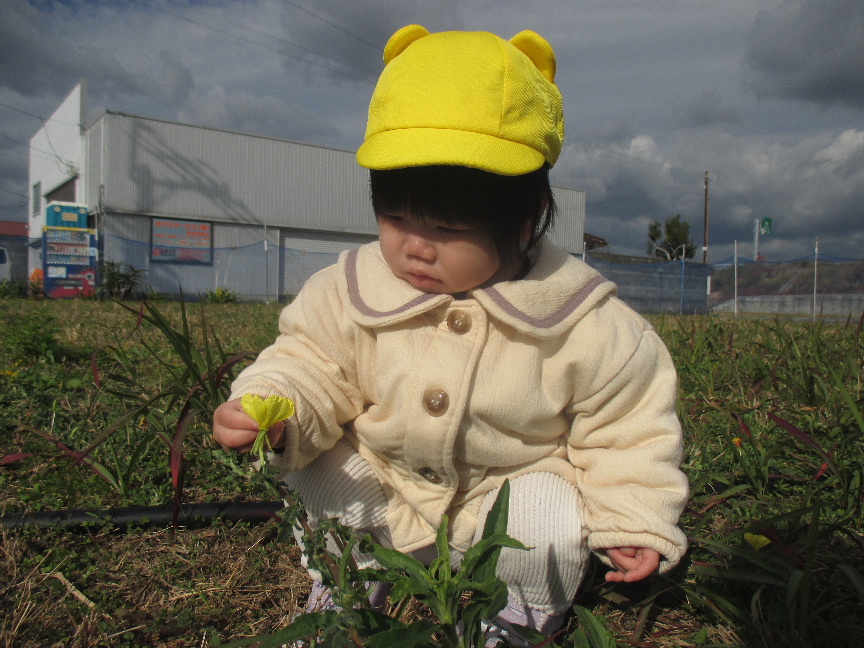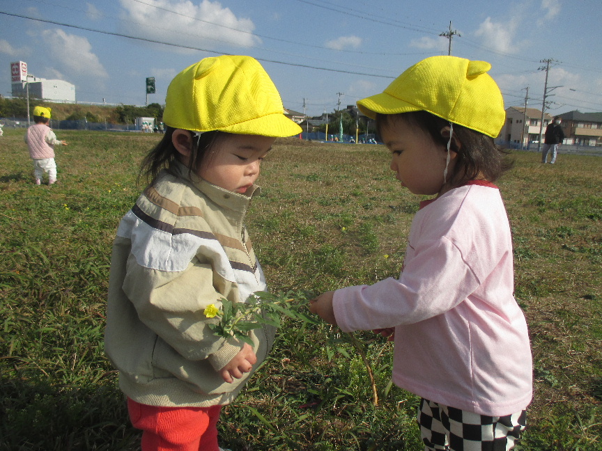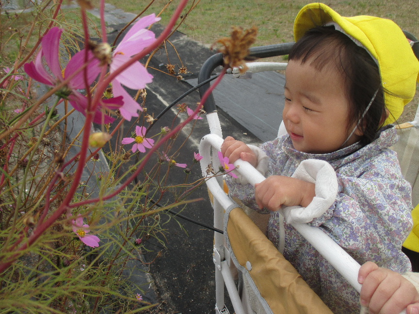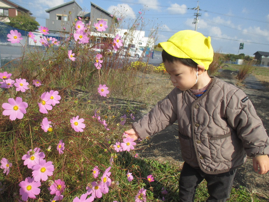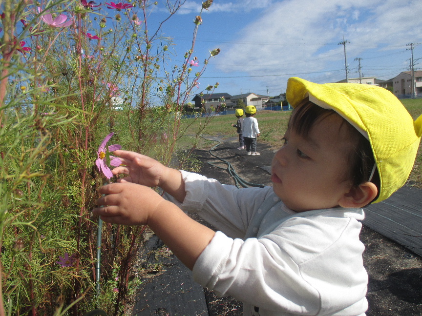 コスモスにバッタが止まっていることを伝えると、捕まえてみようとそーっと手を伸ばしたり、きれいに咲いているコスモスに優しく触ってみたり、摘んだお花をお友だちに手渡したりしている様子も見られました♫
