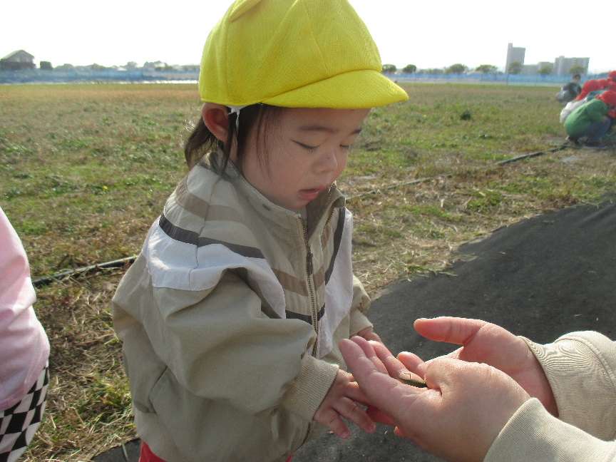 保育教諭が見つけたバッタを見せると、ジーっと見たり触ってみようとしたり興味津々!