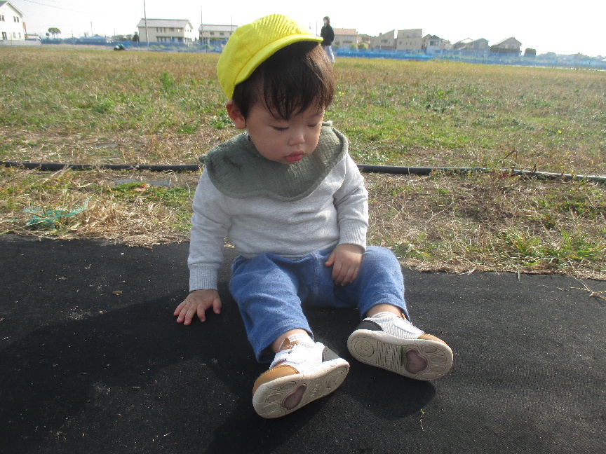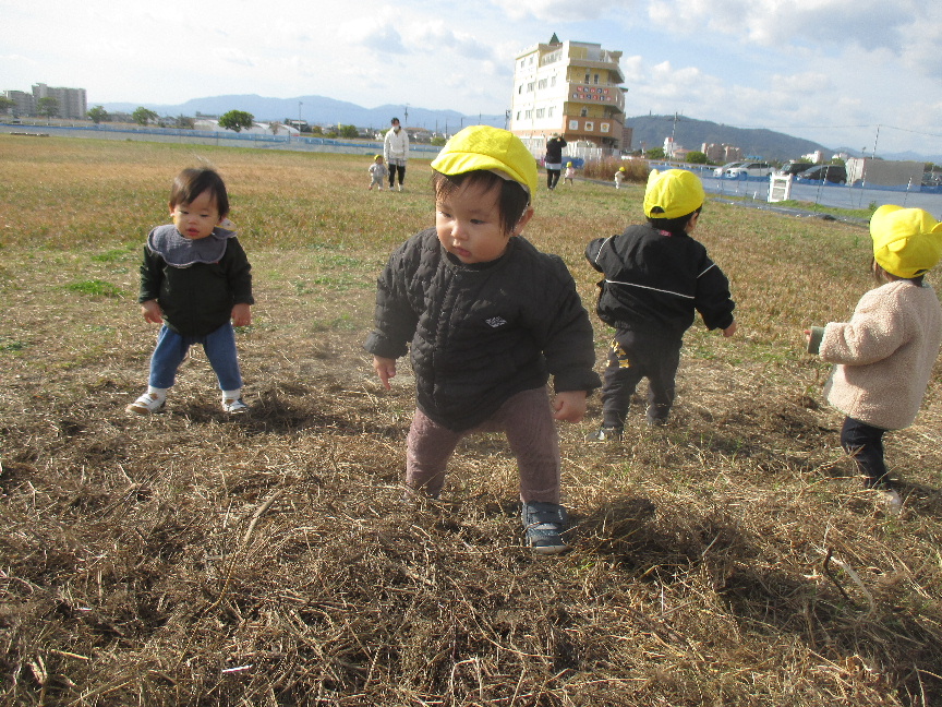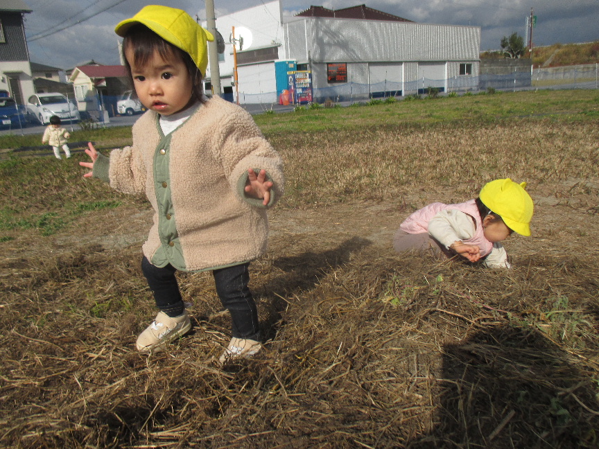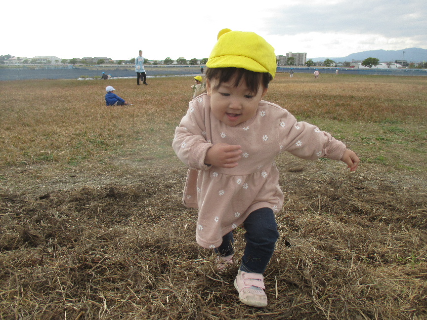 広場の真ん中には枯草のお山があり”よいしょっ”と登ってみたり、枯草を踏んで感触を楽しんだり、お空を飛んでいる飛行機やヘリコプター、道路を走っているバスやトラックを見つけると嬉しそうに手を振っていました♡