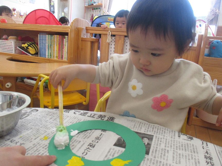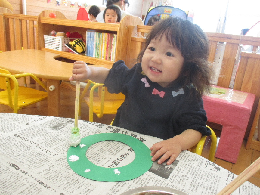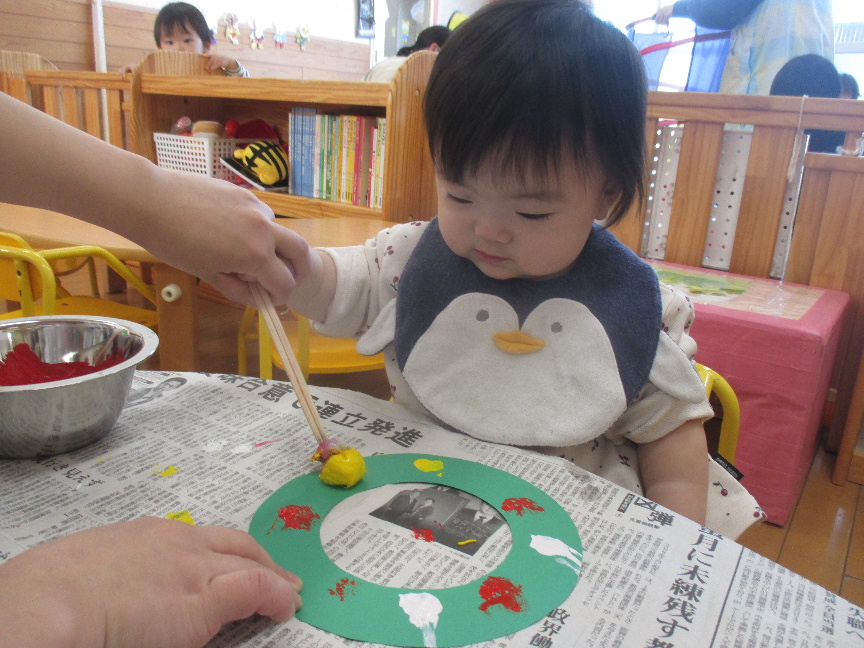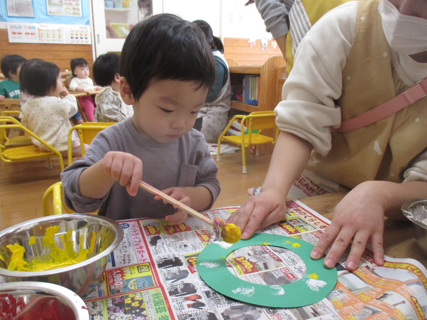 室内ではクリスマス製作をしました!タンポに絵の具を付けると、保育教諭と一緒にポンポンと色付けしていきます☺一人で挑戦する子や「ポンッポンッ」と声に出しながら進めている子もいました!