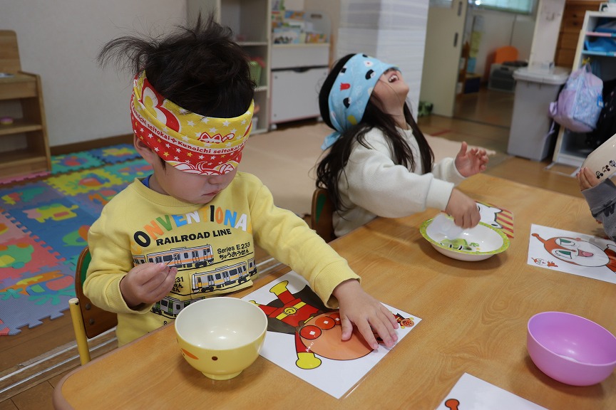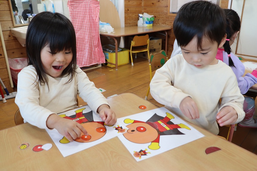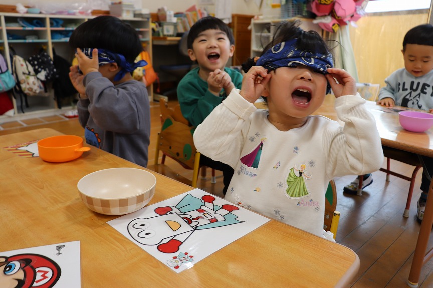 福笑いをしました👧👦「どこかな~?」や「あれ~?」と言いながら一生懸命キャラクターの顔を完成させていました!タオルを外してキャラクターを見てみると、面白い顔になっていて大笑いのすみれ組さんです🎶新年からいっぱい笑って良いスタートが切れました🌷