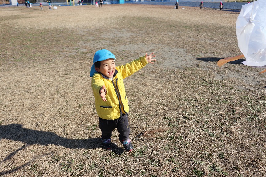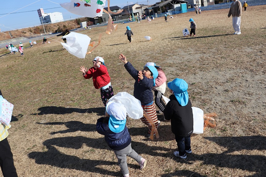 子どもたちが描いたぬりえを袋に貼ってオリジナルの凧を作りました🐙広場で「まてまて~!」と追いかけたり、楽しそうに飛ばしたりする姿が見られました👀