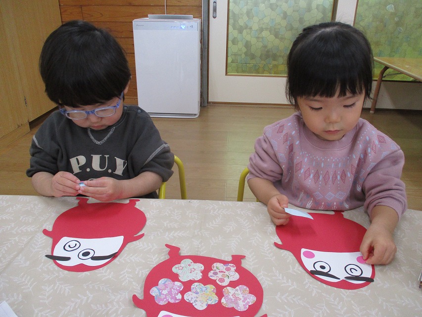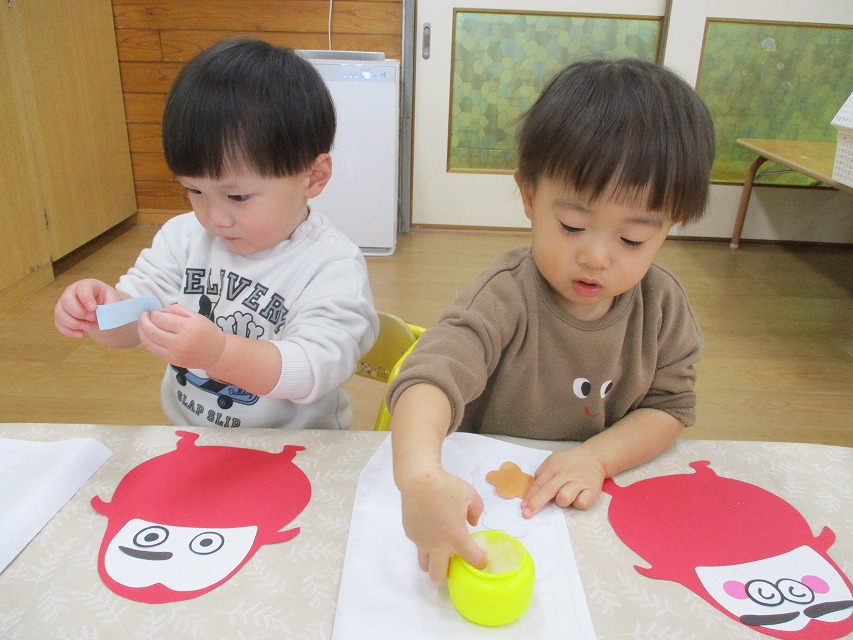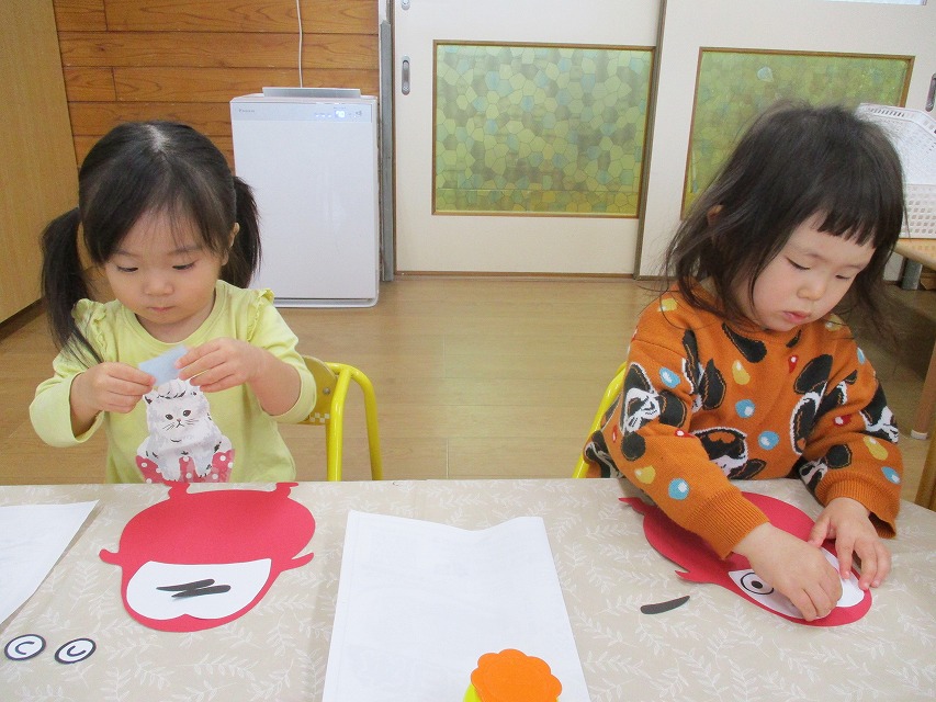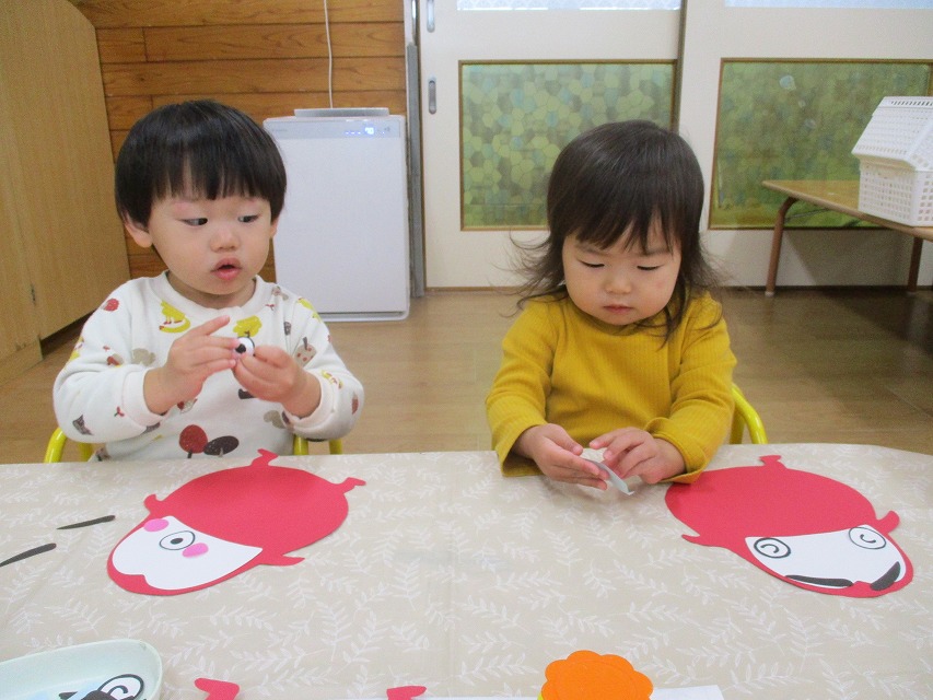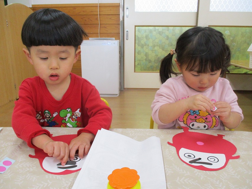 初めて糊付けに挑戦しました。1の指をして指先に糊をつけて慎重に塗っていました。目や眉毛、頬のパーツはそれぞれ思い思いの場所に貼っていました。個性あふれる可愛いだるまさんが完成しました☆彡