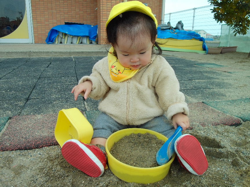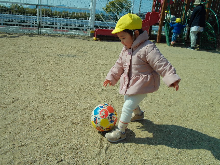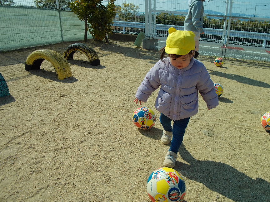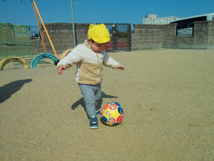 園庭では初めてサッカーボールで遊びました⚽嬉しそうに抱えて走ったり、「エイッ」と声を出しながら上手に蹴っている子もいました!