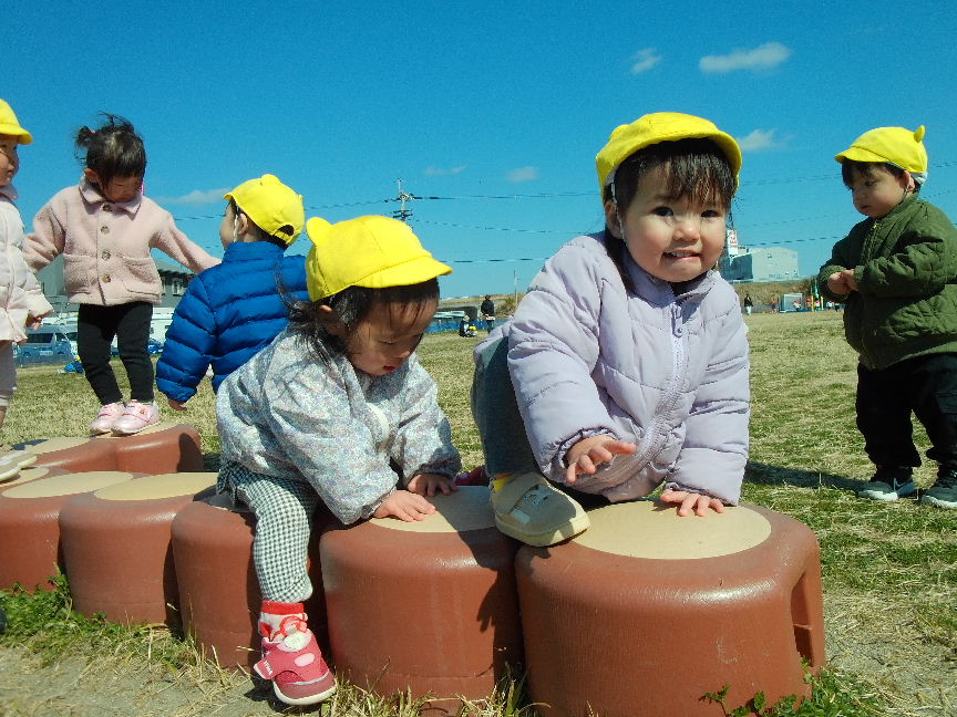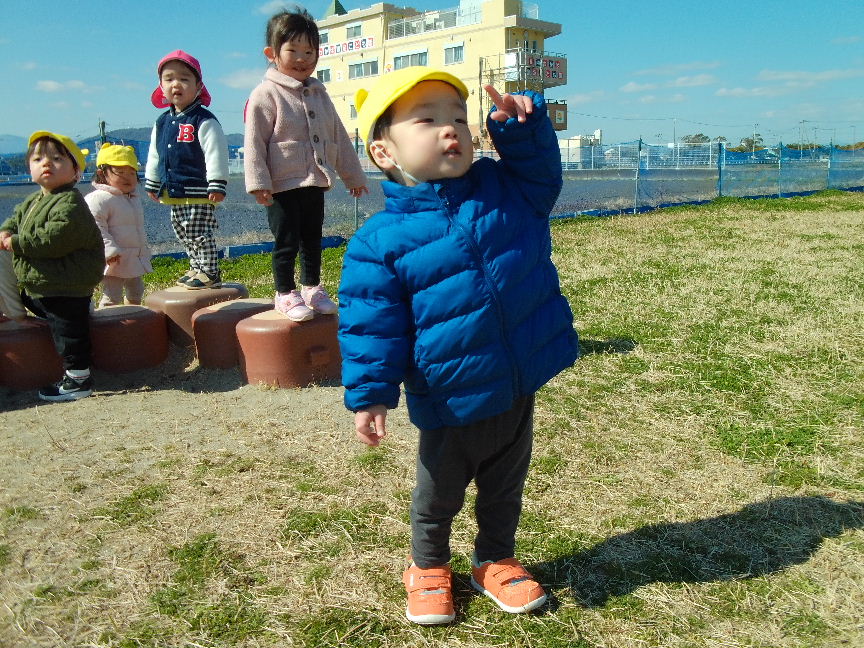 広場では切り株の遊具に登ったり、上をそーっと歩いてみたりしています!お空を飛んでいる飛行機やヘリコプターを見つけると、指差しでみんなに教えてくれたり「ばいばーい」と手を振ったりして楽しんでいます☺